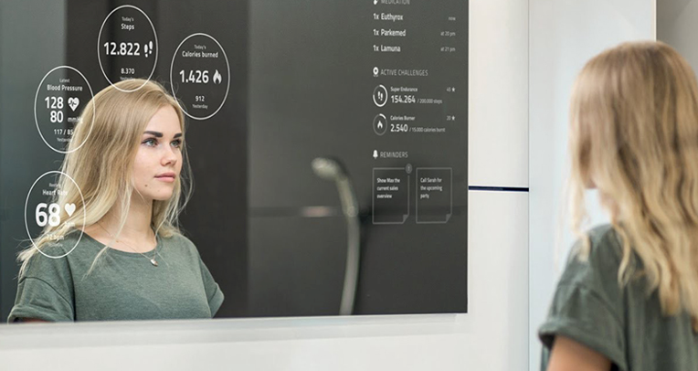 گیلان فردا-آینه هوشمند-این آینه با یک صفحه نمایش و قابلیتهای بسیار زیاد و متنوعی همراه است که با وجود آن زندگی آسانتر میشود. تکنولوژی تشخیص چهره به آینه این امکان را میدهد تا بر اساس نیاز فرد و متناسب با ویژگیهای همان شخص پاسخهایی را ارائه دهد. با آینه هوشمند care os میتوانید به صورت مجازی لباسهای مختلفی را پرو کنید تا ببینید چه رنگ و مدلی به شما میآید!